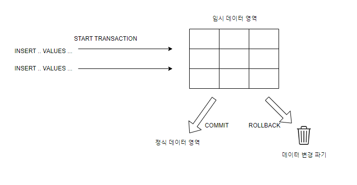 트랜잭션 내에서 실행된 SQL 명령은 임시 데이터 영역에서 수행되다가, COMMIT 명령을 내리면 임시 데이터 영역에서 정식 데이터 영역으로 변경이 적용 됩니다. ROLLBACK 명령을 내리면 임시 데이터 영역에서의 처리는 버려지게 됩니다.