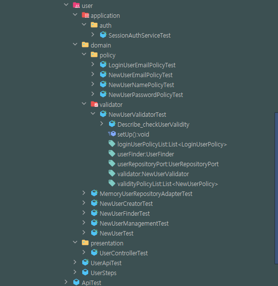 위 코드는 앞서 말한 의존성을 직접 주입해 준 테스트 코드의 일부입니다. 이렇게 모든 의존성을 주입해 주게 되니, 구현 세부 사항에 집중한 테스트 코드를 작성하는 방향으로 흘러가게 되었습니다. 해당 테스트 코드를 리팩토링 한다면 NewUserManagement에서 기대되는 동작에 집중해 테스트를 작성하기 위해, 테스트 더블 기법을 이용해 리팩토링 할 수 있을 것 같습니다.( 테스트 더블은 테스트하려는 코드를 주변 환경에서 분리하게 도와주는 객체 또는 테스트 작성 시 테스트 대상 코드와 상호작용 하는 객체입니다)