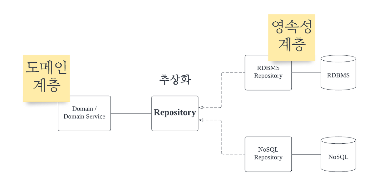 Domain의 관점에서는 Repository라는 추상화된 객체에서 데이터를 조작하는데 필요한 인터페이스를 제공해주고, 그 인터페이스를 토대로, 원하는 결과만 받아올 수 있기 때문에, 영속성 계층에서 실제 데이터가 어떻게 조작되는지는 알 필요가 없게 됩니다.