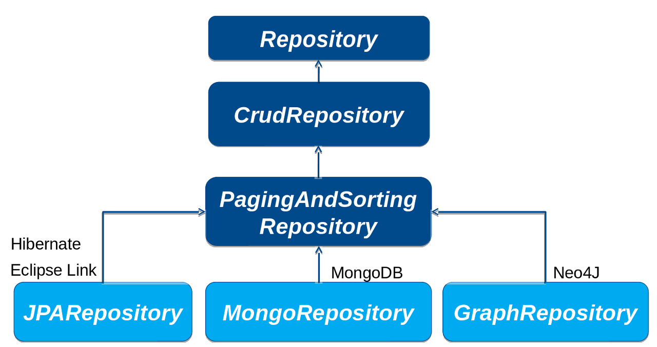 그림과 같이 Spring Common Module에 속한 Repository, CrudRepository, PagingAndSortingRepository를 통해 그 하위 저장소로 Jpa,Mongo,Graph등등 어떤것을 사용하게 되더라도, 저 수준 모듈의 변화에 고 수준 모듈이 영향받지 않는 다는 점을 알 수 있습니다.