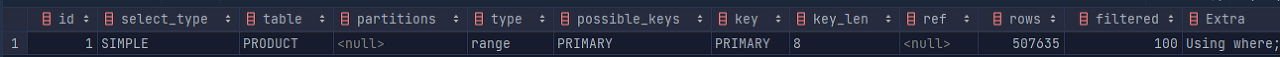 type은 index range 스캔이 일어났고, 조회된 rows의 수는 506735로 앞서 조회한 쿼리의 절반 밖에 데이터 조회가 일어나지 않았습니다.