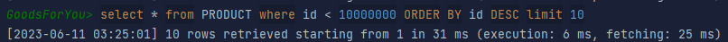 간단하게 LIMIT , offset 키워드를 통해, 상품 데이터를 10개씩 가져오도록 한 결과 입니다. 이렇게 함으로써, 데이터 조회에 걸리는 시간을 15.8초 → 0.09초로 대폭 줄일 수 있었습니다.