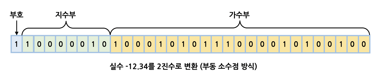 부동소수점 표현방식은 실수를 부호부(sign), 지수부(exponent), 가수부(mantissa)로 나누고, 정규화된값을 각 비트에 나눠 담아 실수를 표현하는 방식입니다. 쉽게 말해 12.3456을 저장한다면 표현식을 0.123456 * 10^2로 변경한 다음, 가수부에는 0.123456을 담고 지수부에는 2를 저장하는 방식입니다.