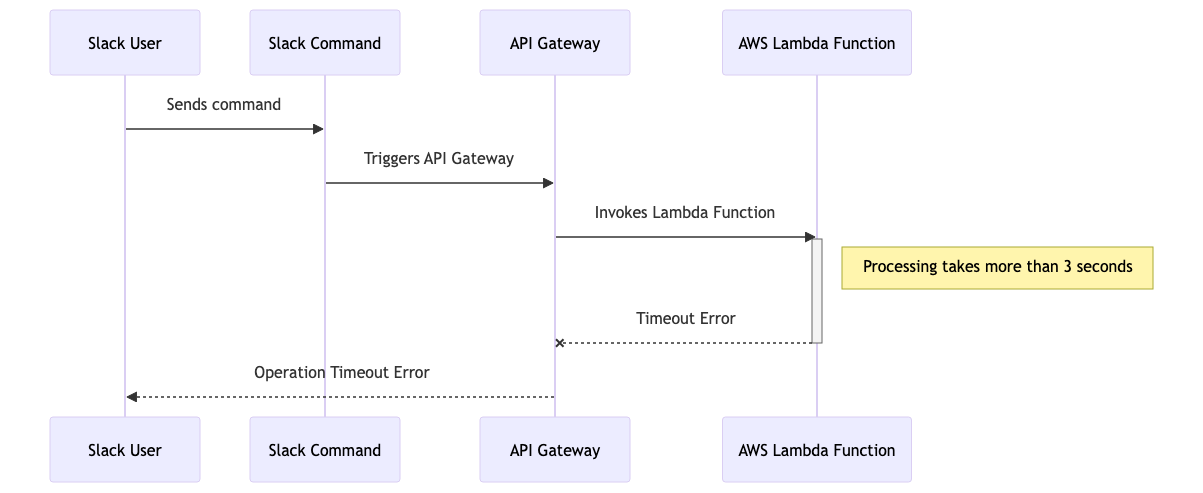 위 그림은 기존에 구현했던 워크플로우 입니다. 문제점은 슬랙에서는 요청을 보낸 후 3초 이내에 응답을 보내주지 않으면 에러를 반환하게 됩니다. https://api.slack.com/interactivity/slash-commands#:~:text=This%20confirmation%20must,ignore%20the%20request