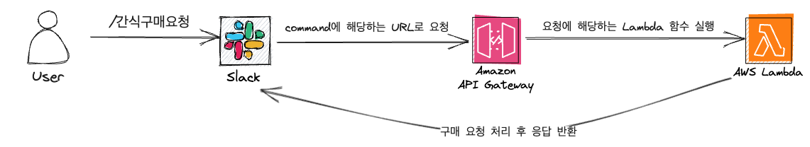 사용자가 "/간식구매요청" 명령어를 입력하면, Slack API가 이를 감지하고 설정된 API 주소로 요청을 보냅니다. 이 주소는 API Gateway에 설정되어 있으며, Gateway는 이 요청을 받아 Lambda 함수를 실행시킵니다.